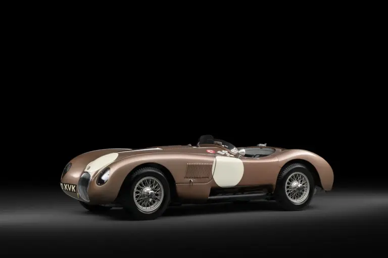 Der 1952 Jaguar C‑Type XKC 018 ist ein Automobil, das Geschichte atmet: Ein Fahrzeug, das einst neu gekauft wurde von Juan‑Manuel Fangio, dem fünfmaligen Formel‑1‑Weltmeister, und das im Laufe seines Lebens die Bühne von Buenos Aires bis Pebble Beach betreten hat. Sein erster Lebensabschnitt in Argentinien, gelenkt von José Millet, dem örtlichen Jaguar‑Händler, prägt die frühe Rennbiographie dieses C‑Types ebenso wie die späteren europäischen und amerikanischen Auftritte. Auffällig ist die außergewöhnliche Lackierung in Bronze mit silbernen Zierlinien – ein Unikat unter den C‑Types. XKC 018 verbindet die Aura klassischer Siegerrennen mit der Patina zahlreicher Einsätze; konserviert wurde es über Jahrzehnte so, dass sein Charakter als Rennwagen erhalten blieb und dennoch die Eleganz eines britischen Sportwagens der frühen 1950er Jahre ausstrahlt.