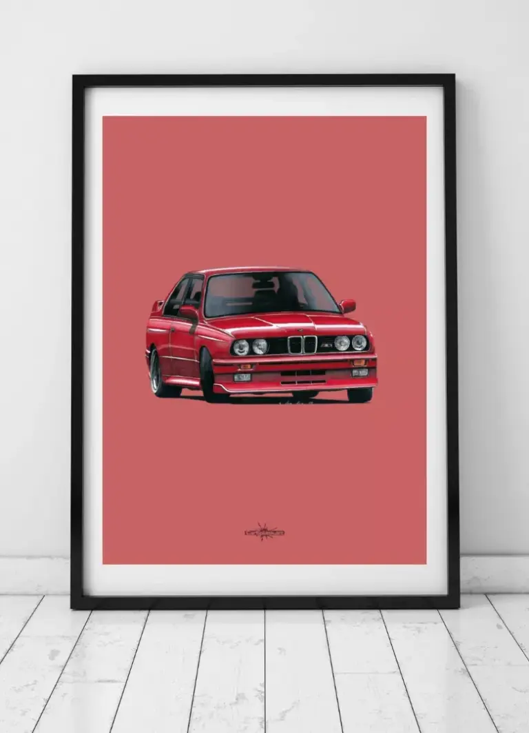 Handgezeichnete BMW E30 M3 Kunst für die Garage