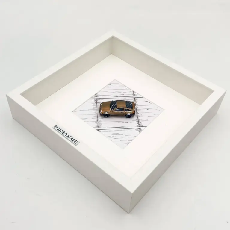 Gerade im 1:64‑Bereich haben sich Custom-Modelle zu einer eigenen Szene entwickelt. Viele Modelle lassen sich mit Dioramen kombinieren – hier steht jedoch die Rahmung im Vordergrund: Der CRX kommt als dekoratives Kunstobjekt, das die vertraute, kompakte Silhouette und die klar erkennbare Dachlinie betont. Selbst als Miniatur wirkt der Wagen wie ein kleines Leichtbau-Geschoss – nur eben als Wand- oder Tischkunst statt als losgelassenes Spiel- oder Diorama-Modell.