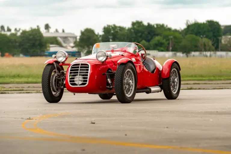 Der 1949 Dagrada Giannini Fiat 750 Sport wirkt wie ein Telegramm aus Italiens wirtschaftlichem Neubeginn: knapp, zielstrebig, voller Erfindergeist. Entworfen von Angelo Dagrada, ruht er auf einem Rohrrahmen aus Stahl, der mit einer handgeformten Aluminiumhaut überzogen ist. Das Ergebnis ist eine federleichte Barchetta im „Siluro“-Stil – eine pfeilförmige Skulptur, deren Single-Frontscheinwerfer in der Mitte wie ein zielsicheres Auge blickt. Unter der Haube arbeitet ein Giannini G1 mit 750 cm³, auf Basis des Fiat 500 Topolino und mit Siata-Zylinderkopf, gut für rund 41 kW (55 PS). Ein manuelles Getriebe überträgt die Kraft. Diese mechanische Direktheit macht den Wagen zeitlos. Leichtbau, Klarheit und Funktion verbinden sich zu einer Form des Fahrens, die Mobilität als pure Erfahrung zelebriert.