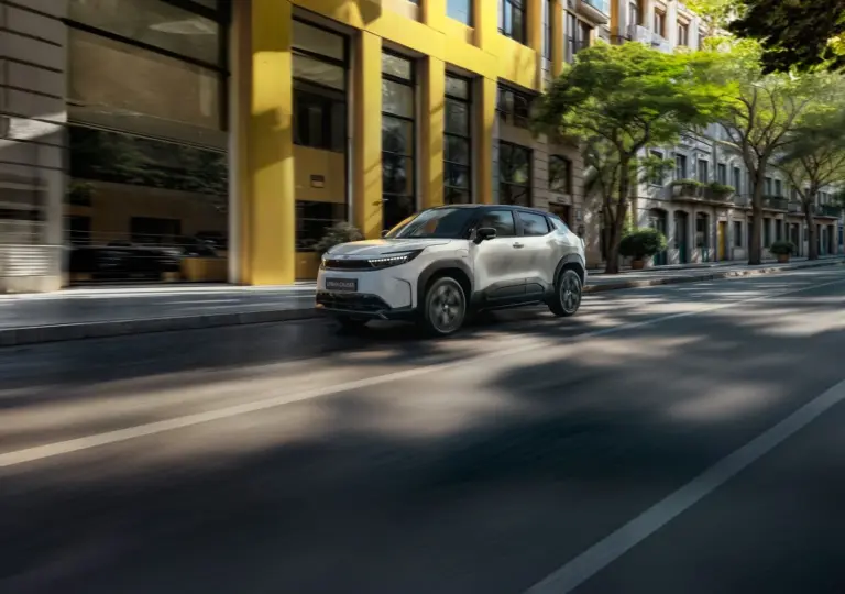 Toyota Urban Cruiser Elektro-SUV fährt auf einer städtischen Straße vor modernen Gebäuden