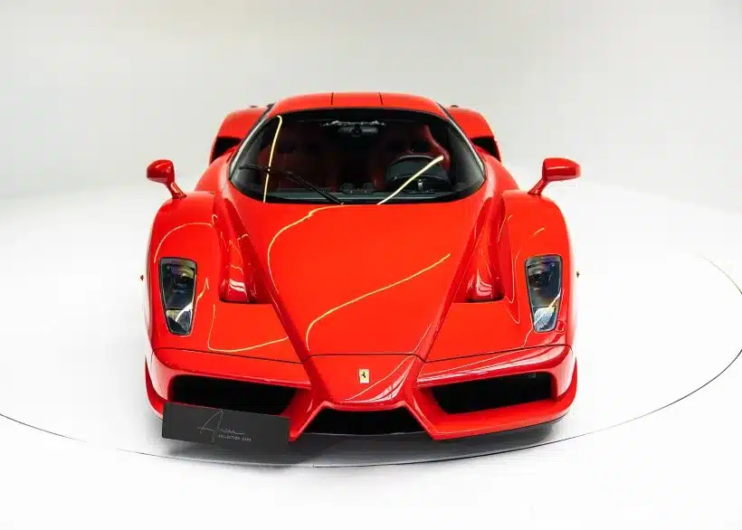 Der Ferrari Enzo in leuchtendem Rot, frontal aufgenommen, präsentiert die charakteristische Aerodynamik und markante Linienführung des Supersportwagens. (Fotos: Anbieter, siehe unten)