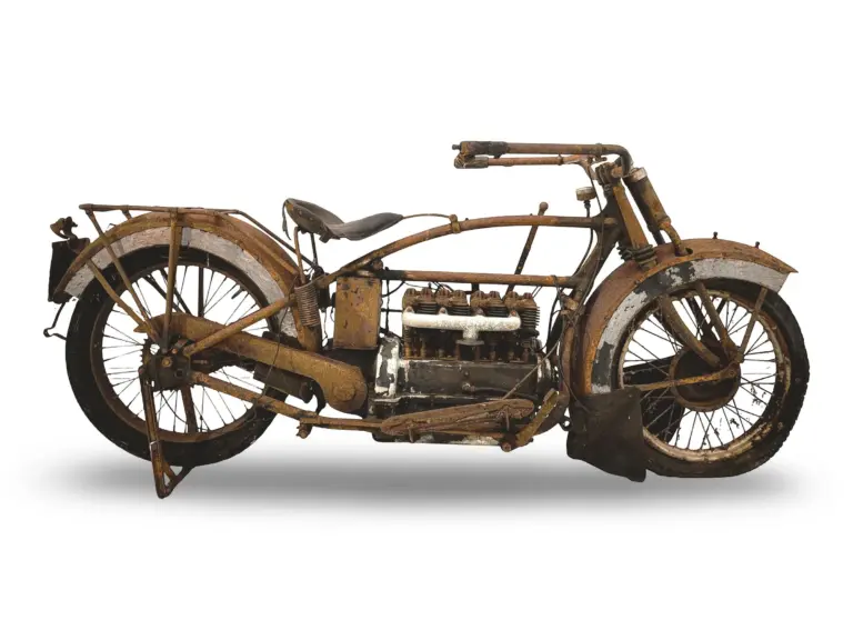 Die Henderson De Luxe von 1925 gehört zu einer Epoche, in der Motorräder nicht nur Transportmittel, sondern rollende Versprechen von Technik und Luxus waren. Mit einem seitlich hängenden Reihenvierzylinder und 1.300 cm³ Hubraum zeigte dieses Modell, wie amerikanische Ingenieurskunst sanfte Leistungsentfaltung mit Eleganz verbinden konnte. Schon der Motorname, ein 1,3‑Liter‑Aggregat, weckt Assoziationen an lange Reisen und souveräne Landstraßengeschwindigkeiten. In den Zwanzigern zählte die De Luxe zu den schnellsten Serienmaschinen ihrer Zeit und erreichte in Prüfungen Spitzengeschwindigkeiten jenseits der 160 km/h, eine Zahl, die noch heute Respekt hervorruft. Ihr Fahrwerk wurde 1925 überarbeitet: ein tiefergelegter Hinterbau senkte die Sitzhöhe, verbesserte die Ergonomie für Touring und stabilisierte das Fahrverhalten bei hohen Geschwindigkeiten. Zusätzlich gab es Feinarbeiten am Tank und an der Federung, die den Komfort auf langen Strecken weiter erhöhten.