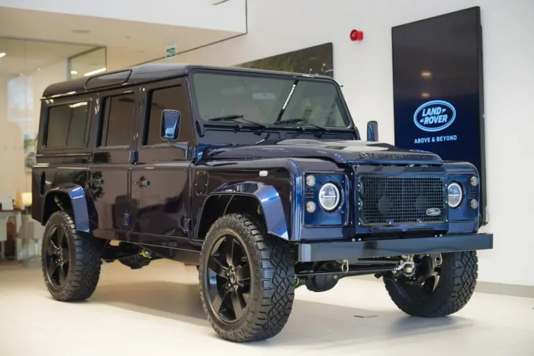 Außen setzt der Defender 110 auf klare Zeichen. Die rund 51 Zentimeter großen, 20-Zoll-Räder für den Defender füllen die Radhäuser stimmig und geben dem Wagen jene aufrechte Präsenz, die man von dieser Silhouette erwartet. Ein spezielles Doppel-Auspuffsystem ergänzt den Auftritt mit einer dezent kraftvollen Note, ohne die gelassene Art des 300 TDI zu übertönen. Die Lackierung in Tanzanite Blue bringt Tiefe und Eleganz ins Bild; je nach Licht wirkt der Ton fast samtig und lässt die Kanten der Karosserie fein modelliert erscheinen. In Summe entsteht ein Look, der das zweckmäßige Erbe betont und zugleich eine individuelle Handschrift setzt. Die LED-Front- und Heckleuchten rahmen das Ganze mit klarer Signatur – sichtbar modern, aber respektvoll gegenüber der Form, die seit Jahrzehnten Menschen bewegt.