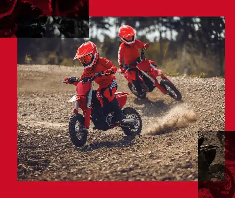 Zwei Kinder fahren die rote GASGAS MC-E 3 2024 auf einer Offroad-Strecke.