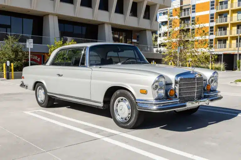 Das klassische Mercedes-Benz 280SE Coupé W111, Baujahr 1970, in Silbergrau metallic mit schwarzer Lederausstattung, in einem modernen urbanen Umfeld. (Fotos: Anbieter, siehe unten)