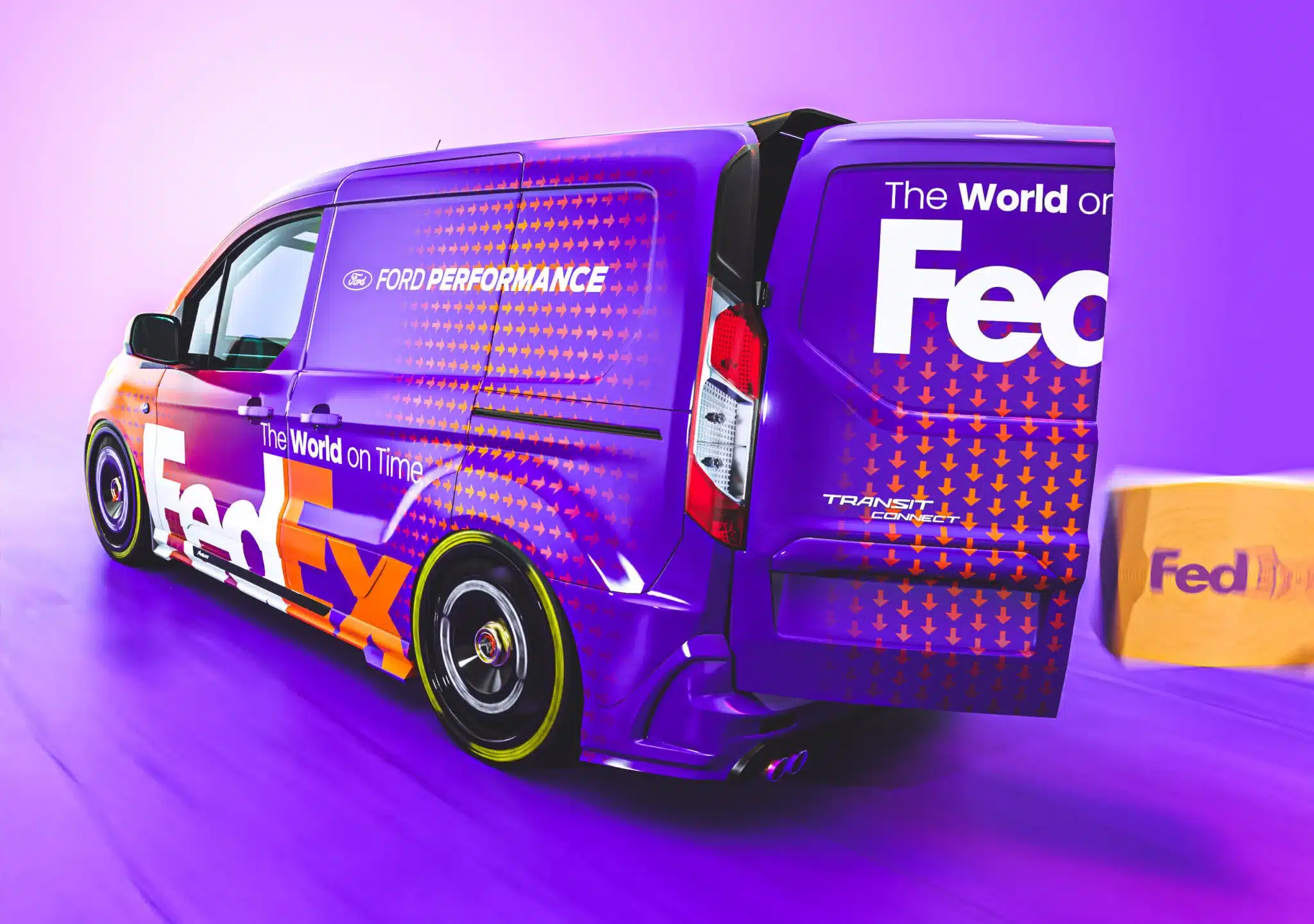 Das Herzstück dieses Projekts ist das Livery-Konzept im FedEx-Tribute-Look. Die Gestaltung spielt mit einem Farbverlauf aus zwei ikonischen Markenfarben, die den Transit Connect optisch strecken und ihm mehr Präsenz verleihen. Statt beliebiger Streifen wird das charakteristische Pfeil-Emblem des FedEx-Logos als wiederkehrendes Designelement genutzt. Dadurch entsteht ein klarer, wiedererkennbarer Look mit grafischer Tiefe, der sich von typischen Flottenfolierungen abhebt.