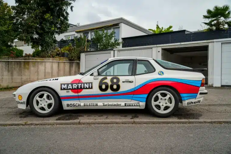 Porsche 944 von 1986, weiß mit Martini-Racing-Folierung, seitlich fotografiert vor Garagen