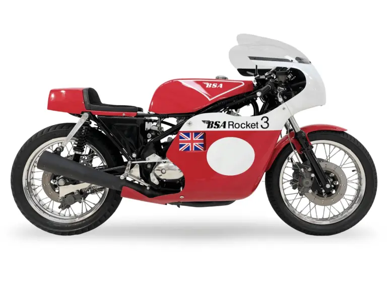 Die Rob North BSA Rocket-III Replica im rennorientierten Classic-Design, Seitenansicht mit Verkleidung und britischer Flagge. (Fotos: Anbieter, siehe unten)