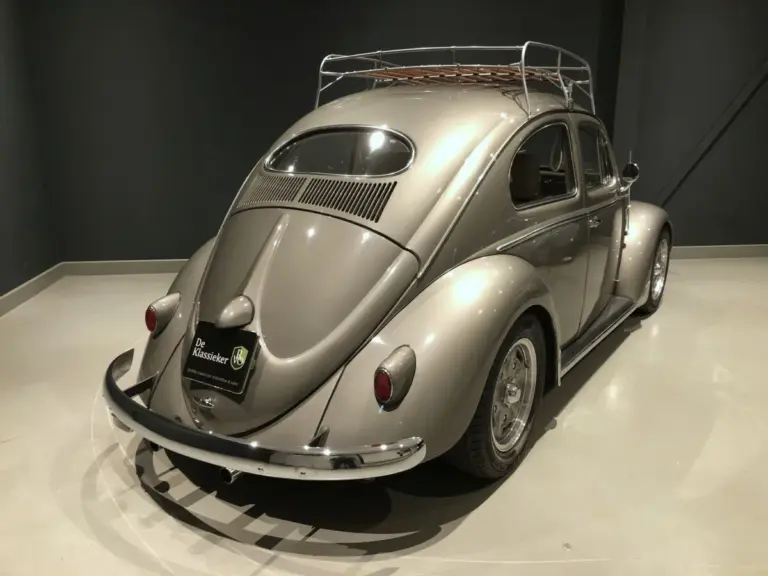 „Ovalfenster“ beschreibt die ovale Heckscheibe, die beim Käfer in der Phase von 1953 bis 1957 verbaut wurde. Dieses Detail ist klein, aber prägt die gesamte Heckansicht: Die Rundung wirkt ruhiger und geschlossener als spätere größere Fensterflächen und gilt vielen Kennern als besonders harmonisch. Am Baujahr 1956 zeigt sich außerdem eine typische Zwischenphase, die Liebhaber wegen ihrer authentischen Formensprache und der klaren, einfachen Gestaltung schätzen. In Verbindung mit der Polar‑Silber‑Lackierung wirkt das Ovalfenster fast wie eine Signatur: zurückhaltend, aber sofort erkennbar.